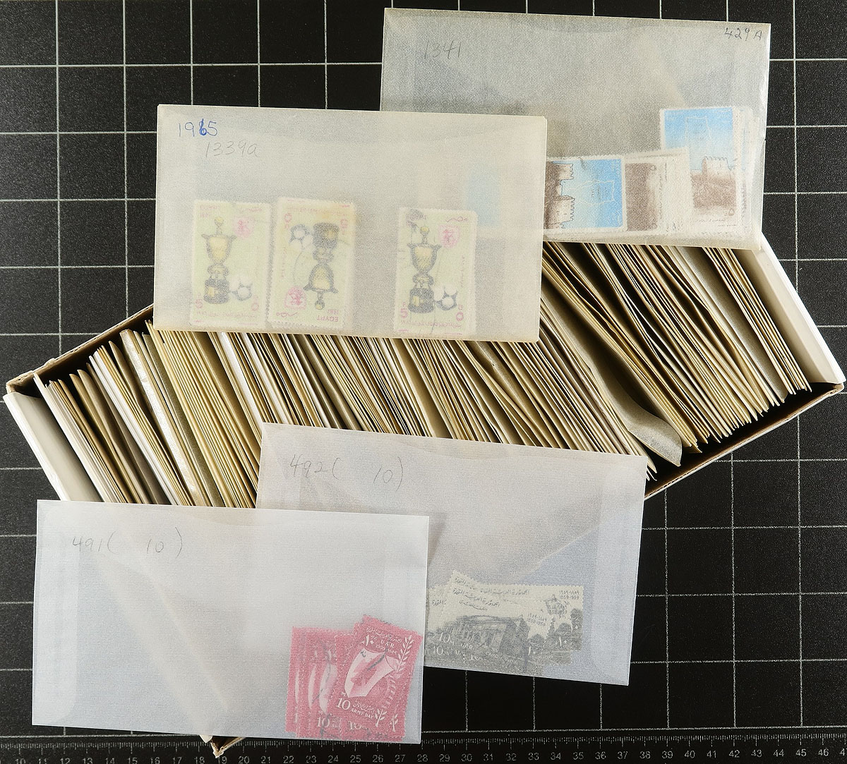 Large used stock of many thousands of stamps, 1879-1993, in a few hundred glassines housed in four shoe boxes. The lot is well organized with each glassines identified by Scott number and quantities within, ranging from Scott #36/1531, with the majority of material post 1900, along with selections of back of the book material. Completely unchecked for postmarks or varieties, ideal for worldwide collectors or specialists, overall fine to very fine. Estimate =