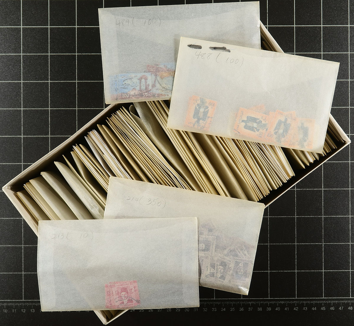 Large used stock of many thousands of stamps, 1879-1993, in a few hundred glassines housed in four shoe boxes. The lot is well organized with each glassines identified by Scott number and quantities within, ranging from Scott #36/1531, with the majority of material post 1900, along with selections of back of the book material. Completely unchecked for postmarks or varieties, ideal for worldwide collectors or specialists, overall fine to very fine. Estimate =