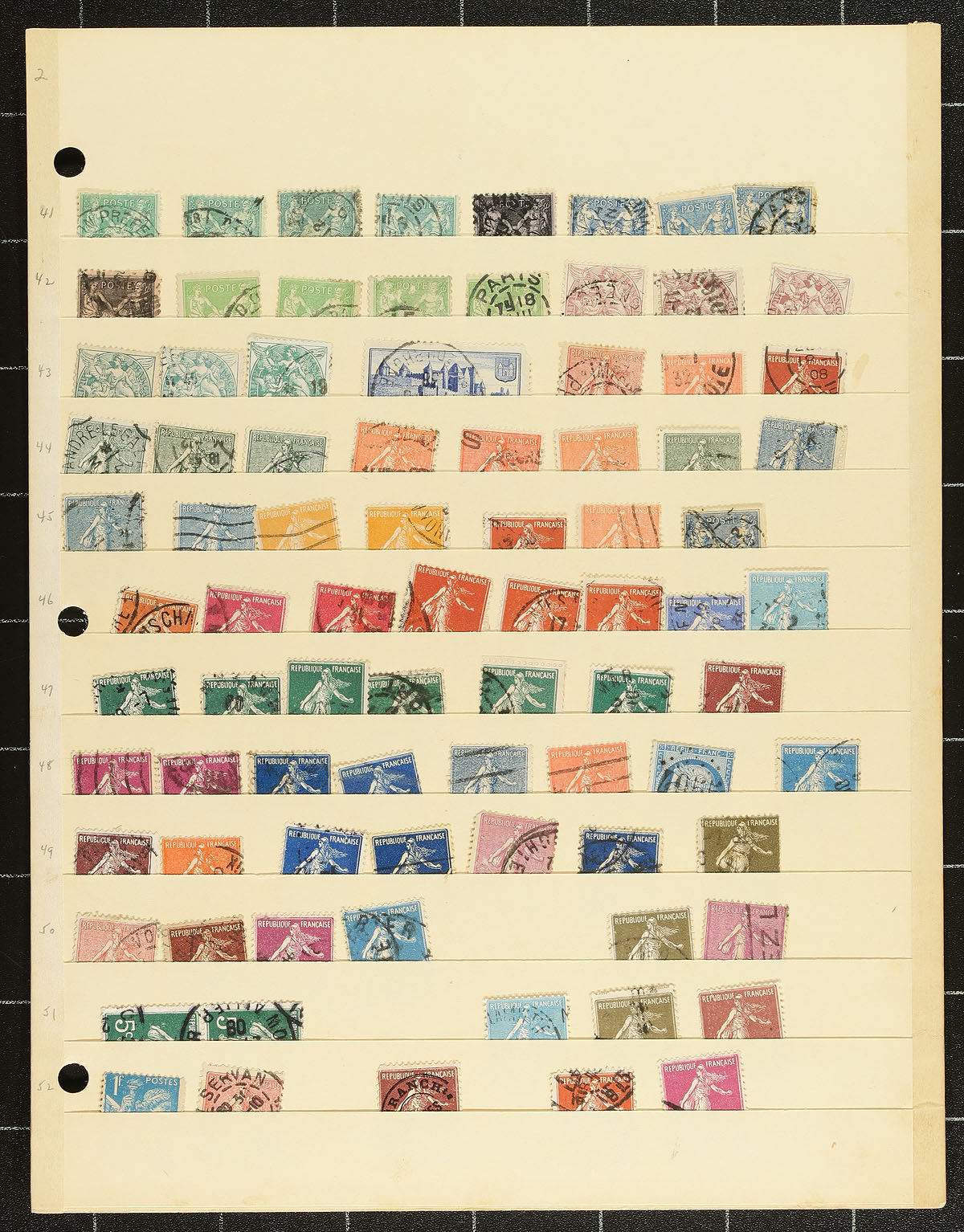 Large accumulation of a few thousand mint and used stamps, 1870's-1995, in roughly 100 manila pages housed in 3 binders, and several 102 cards and glassines. The lot is fairly organized with stamps in the manila pages identified by Scott numbers generally ranging from #78/2451, including back of the book material, with some pages sporadically filled, we encountered a few sets, and never hinged souvenir sheets and sheetlets. The remaining material is loose in a box, presumably to fill out the manila pages, noting a nice mixture of mint and used material. A nice lot for the France or worldwide collector, with possible finds within, overall fine to very fine. Estimate =