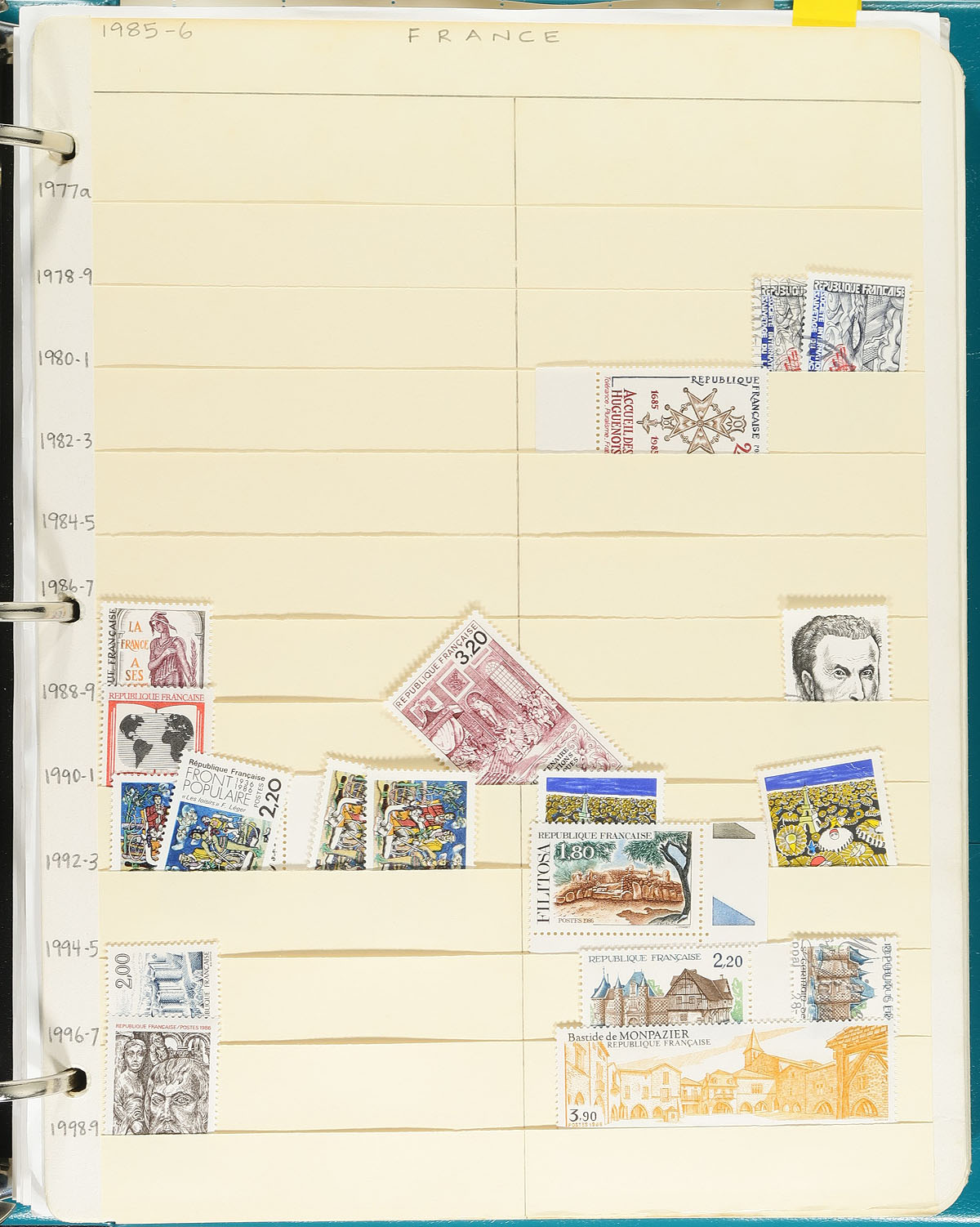 Large accumulation of a few thousand mint and used stamps, 1870's-1995, in roughly 100 manila pages housed in 3 binders, and several 102 cards and glassines. The lot is fairly organized with stamps in the manila pages identified by Scott numbers generally ranging from #78/2451, including back of the book material, with some pages sporadically filled, we encountered a few sets, and never hinged souvenir sheets and sheetlets. The remaining material is loose in a box, presumably to fill out the manila pages, noting a nice mixture of mint and used material. A nice lot for the France or worldwide collector, with possible finds within, overall fine to very fine. Estimate =