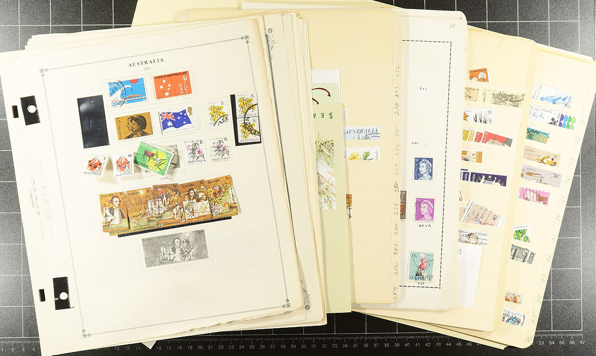 Large accumulation of thousands of primarily used stamps in a few stockbooks and on album pages, filling a bankers box. A cursory look at material indicated better representation from China, Australia, Hong Kong, Netherlands, and bits and pieces of what seemingly appears to be part collections from worldwide countries, generally ranging from the 1880's to the 1980's. Probable finds for the dedicated collector, with a few selected pages to give a taste, overall fine to very fine. Estimate =