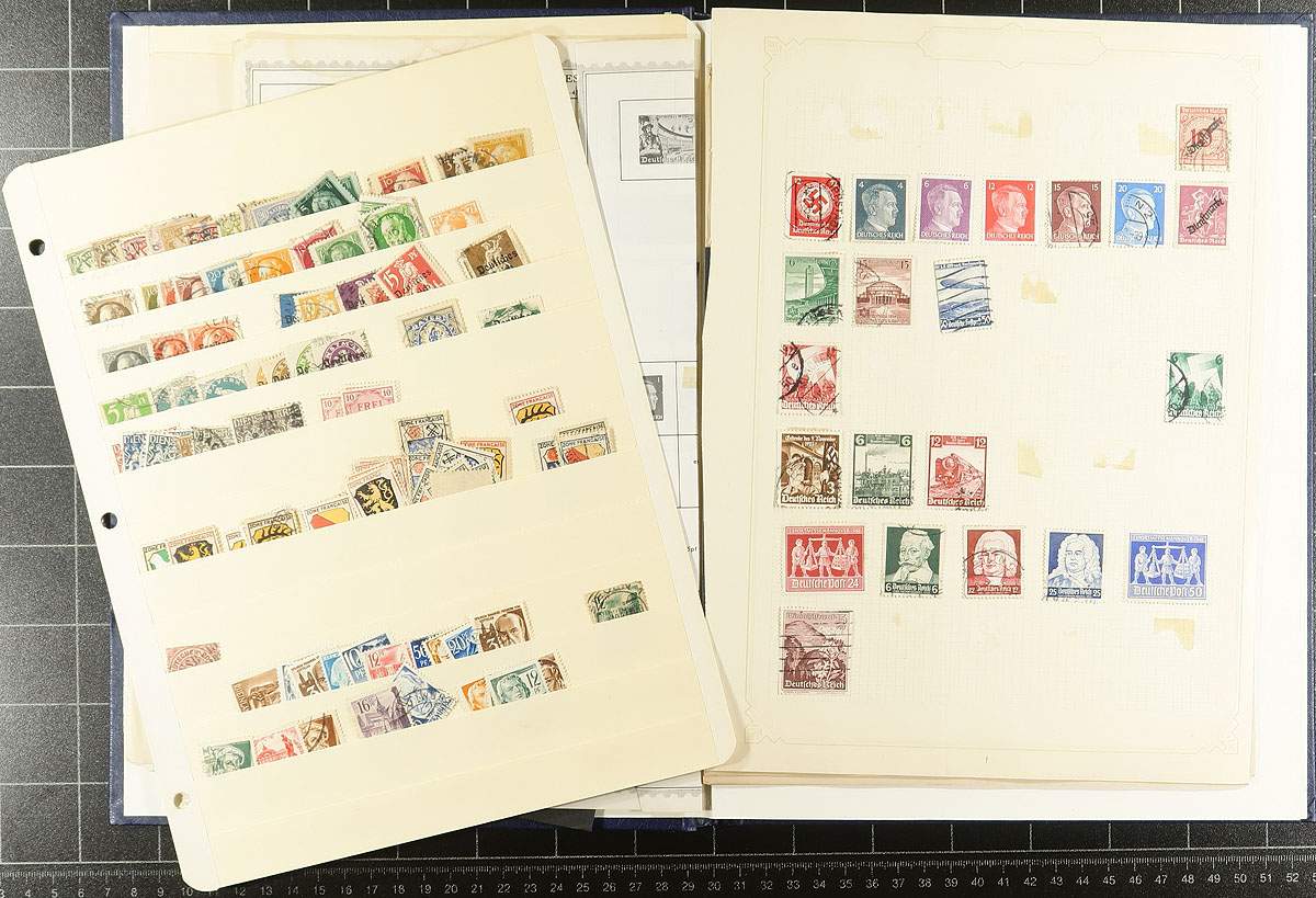 Large accumulation of thousands of primarily used stamps in a few stockbooks and on album pages, filling a bankers box. A cursory look at material indicated better representation from China, Australia, Hong Kong, Netherlands, and bits and pieces of what seemingly appears to be part collections from worldwide countries, generally ranging from the 1880's to the 1980's. Probable finds for the dedicated collector, with a few selected pages to give a taste, overall fine to very fine. Estimate =
