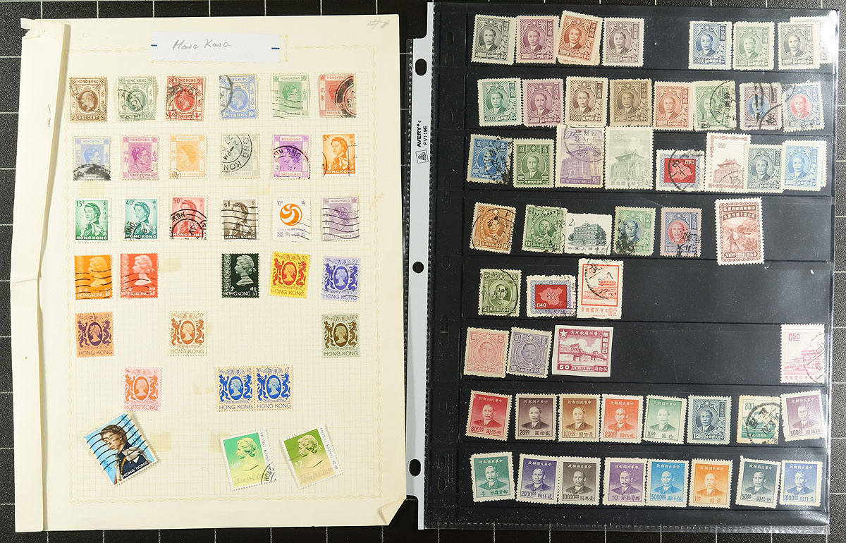 Large accumulation of thousands of primarily used stamps in a few stockbooks and on album pages, filling a bankers box. A cursory look at material indicated better representation from China, Australia, Hong Kong, Netherlands, and bits and pieces of what seemingly appears to be part collections from worldwide countries, generally ranging from the 1880's to the 1980's. Probable finds for the dedicated collector, with a few selected pages to give a taste, overall fine to very fine. Estimate =