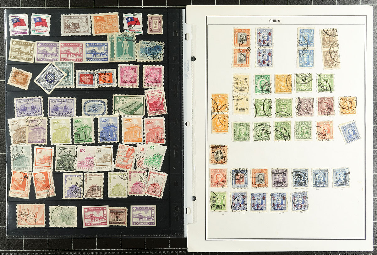 Large accumulation of thousands of primarily used stamps in a few stockbooks and on album pages, filling a bankers box. A cursory look at material indicated better representation from China, Australia, Hong Kong, Netherlands, and bits and pieces of what seemingly appears to be part collections from worldwide countries, generally ranging from the 1880's to the 1980's. Probable finds for the dedicated collector, with a few selected pages to give a taste, overall fine to very fine. Estimate =