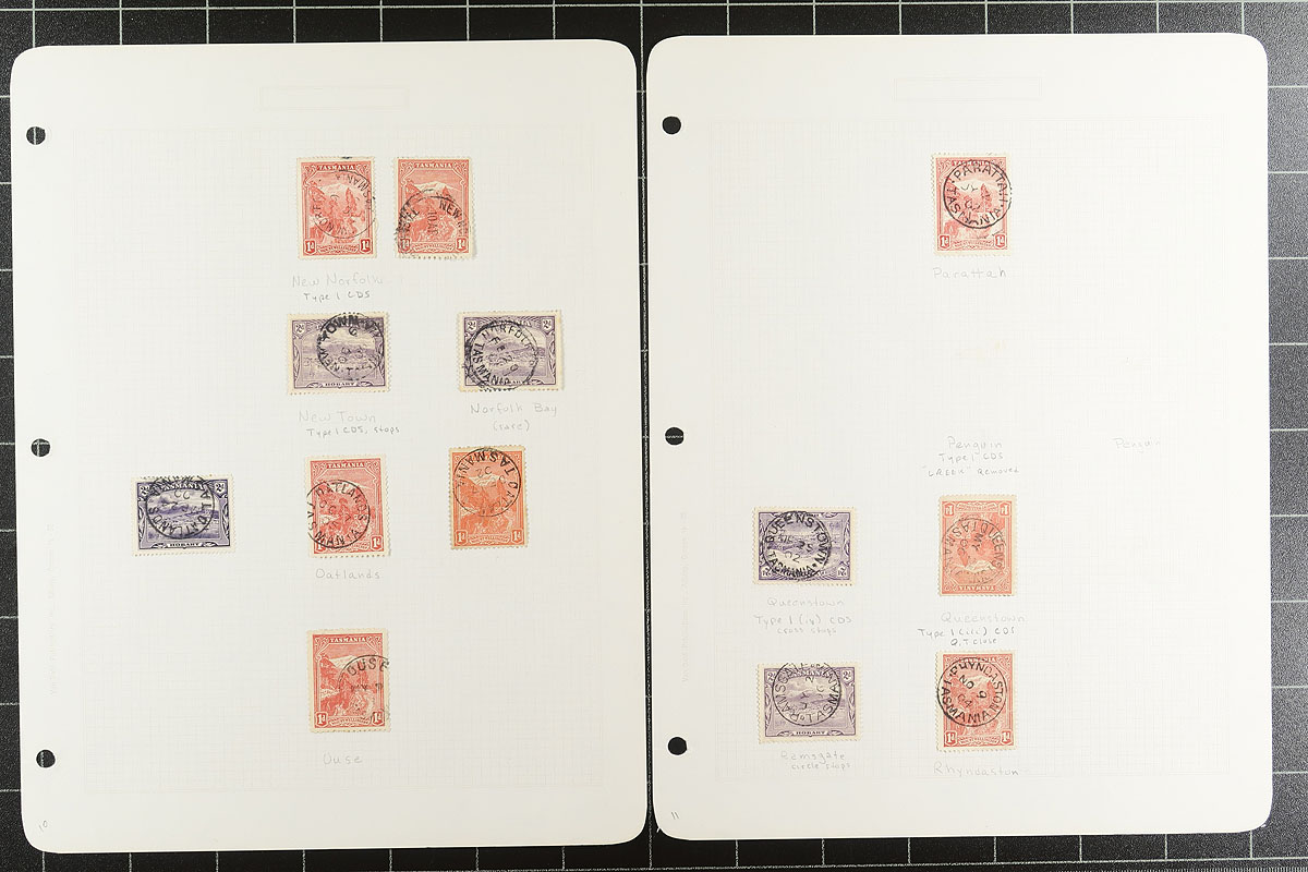 Nice collection of roughly 175 Tasmania stamps, collected for town cancels on homemade pages from the 1900's. The collection contains roughly 100 different towns ranging from A to Z, including Surges Bay, Zeeham, Apsley, Fentonbury, and more, with a few towns having different postmark types. A very nice collection with plenty of "socked on the nose" cancels. An ideal collection for the worldwide postmark collector, and should be continued until completion, overall fine to very fine. Estimate =
