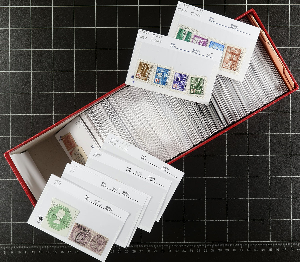 Dealer stock of mint and used stamps in 4 red boxes with lids, containing many thousands of stamps in roughly 2,000 dealer 102 cards. The lot is well organized from countries ranging A to Z (better representation from European countries), with a 4th box containing just Great Britain and Hungary, with stamps primarily ranging from the 1900's to the 1980's, noting some material on both sides of the given range. All of the cards are identified with Scott numbers and older catalogue value, with almost all singles and sets priced $1 and under. Still a nice organized lot for worldwide collectors, in almost new red boxes. Estimate =