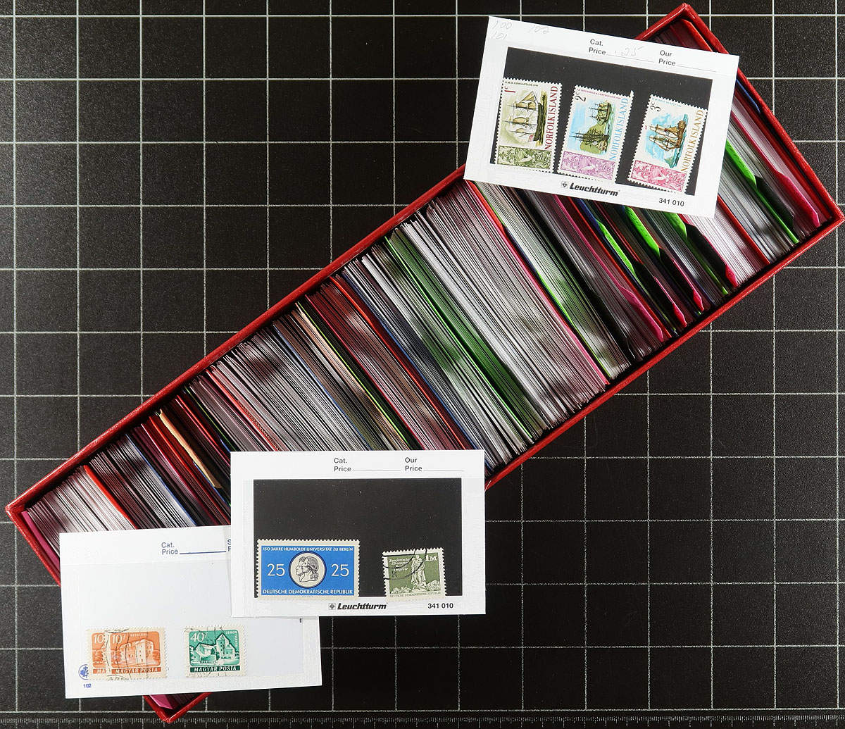 Dealer stock of mint and used stamps in 4 red boxes with lids, containing many thousands of stamps in roughly 2,000 dealer 102 cards. The lot is well organized from countries ranging A to Z (better representation from European countries), with a 4th box containing just Great Britain and Hungary, with stamps primarily ranging from the 1900's to the 1980's, noting some material on both sides of the given range. All of the cards are identified with Scott numbers and older catalogue value, with almost all singles and sets priced $1 and under. Still a nice organized lot for worldwide collectors, in almost new red boxes. Estimate =