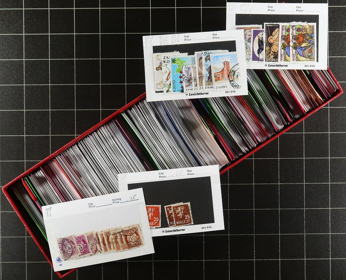 Dealer stock of mint and used stamps in 4 red boxes with lids, containing many thousands of stamps in roughly 2,000 dealer 102 cards. The lot is well organized from countries ranging A to Z (better representation from European countries), with a 4th box containing just Great Britain and Hungary, with stamps primarily ranging from the 1900's to the 1980's, noting some material on both sides of the given range. All of the cards are identified with Scott numbers and older catalogue value, with almost all singles and sets priced $1 and under. Still a nice organized lot for worldwide collectors, in almost new red boxes. Estimate =