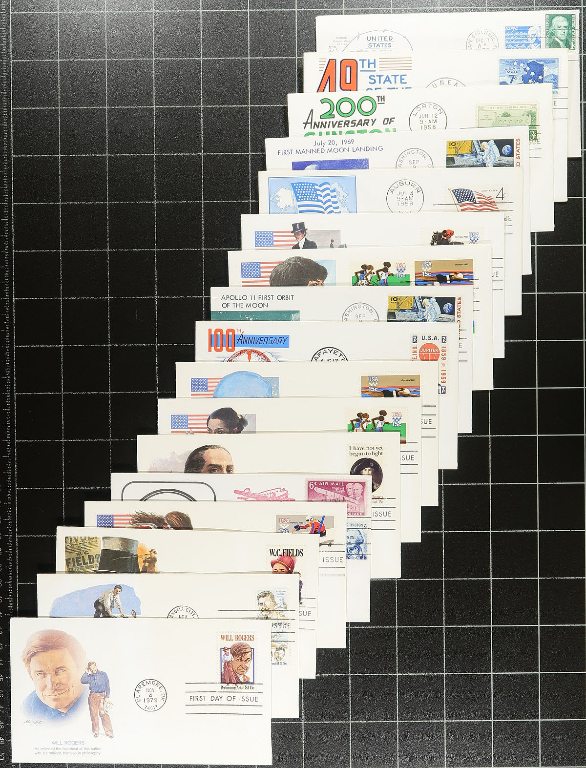 Lovely collection of United States covers in a box, 1950's-1980's, containing roughly 450 items, primarily first day covers, along with space and event covers. We note primarily single frankings with many colourful cachets from makers Cachet Craft, Fleetwood, Art O' Pages, and a few others, along with space covers (noting a few different relevant postmarks). A nice clean group, ideal for collectors or dealers looking for stock, overall very fine. Estimate =