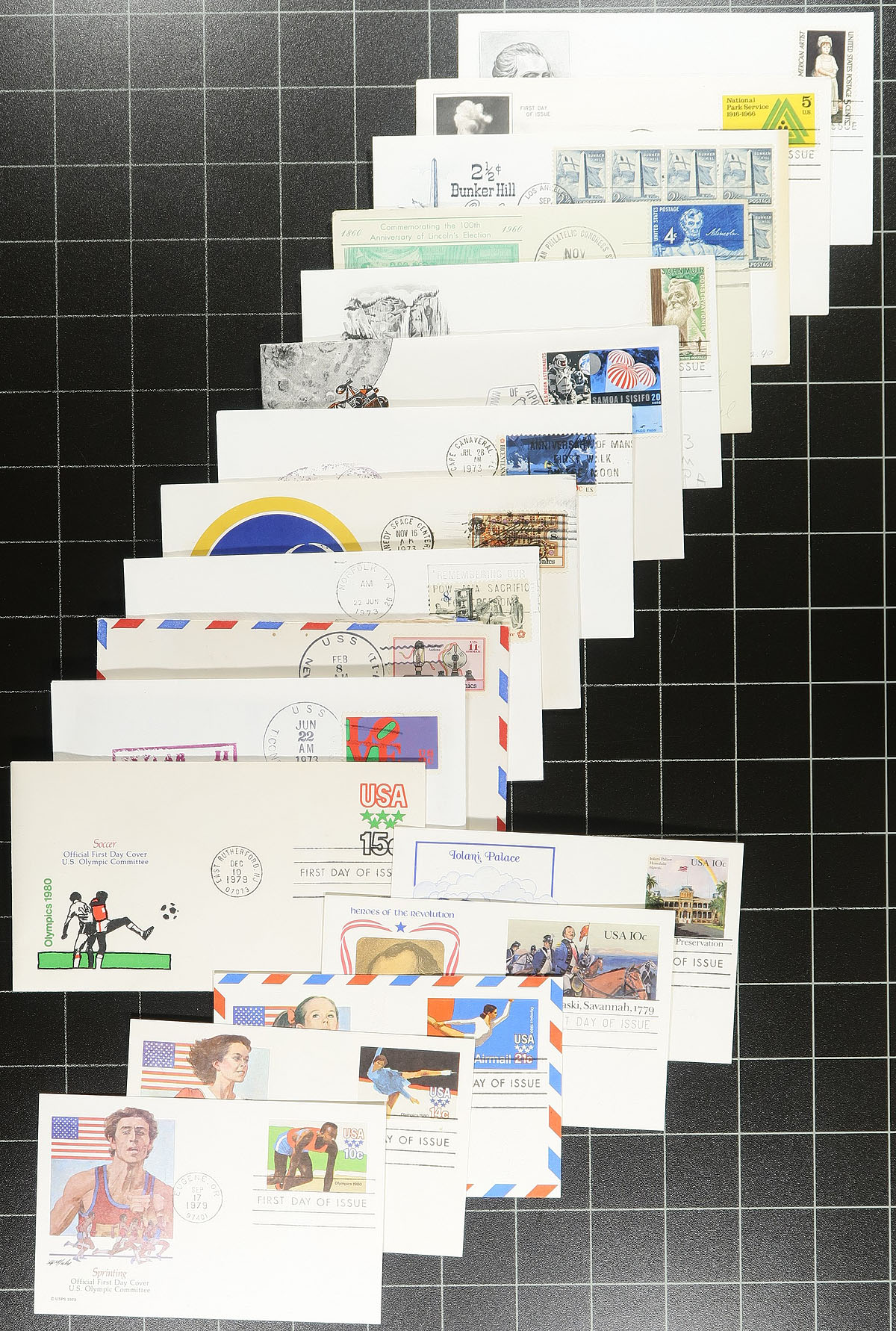 Lovely collection of United States covers in a box, 1950's-1980's, containing roughly 450 items, primarily first day covers, along with space and event covers. We note primarily single frankings with many colourful cachets from makers Cachet Craft, Fleetwood, Art O' Pages, and a few others, along with space covers (noting a few different relevant postmarks). A nice clean group, ideal for collectors or dealers looking for stock, overall very fine. Estimate =