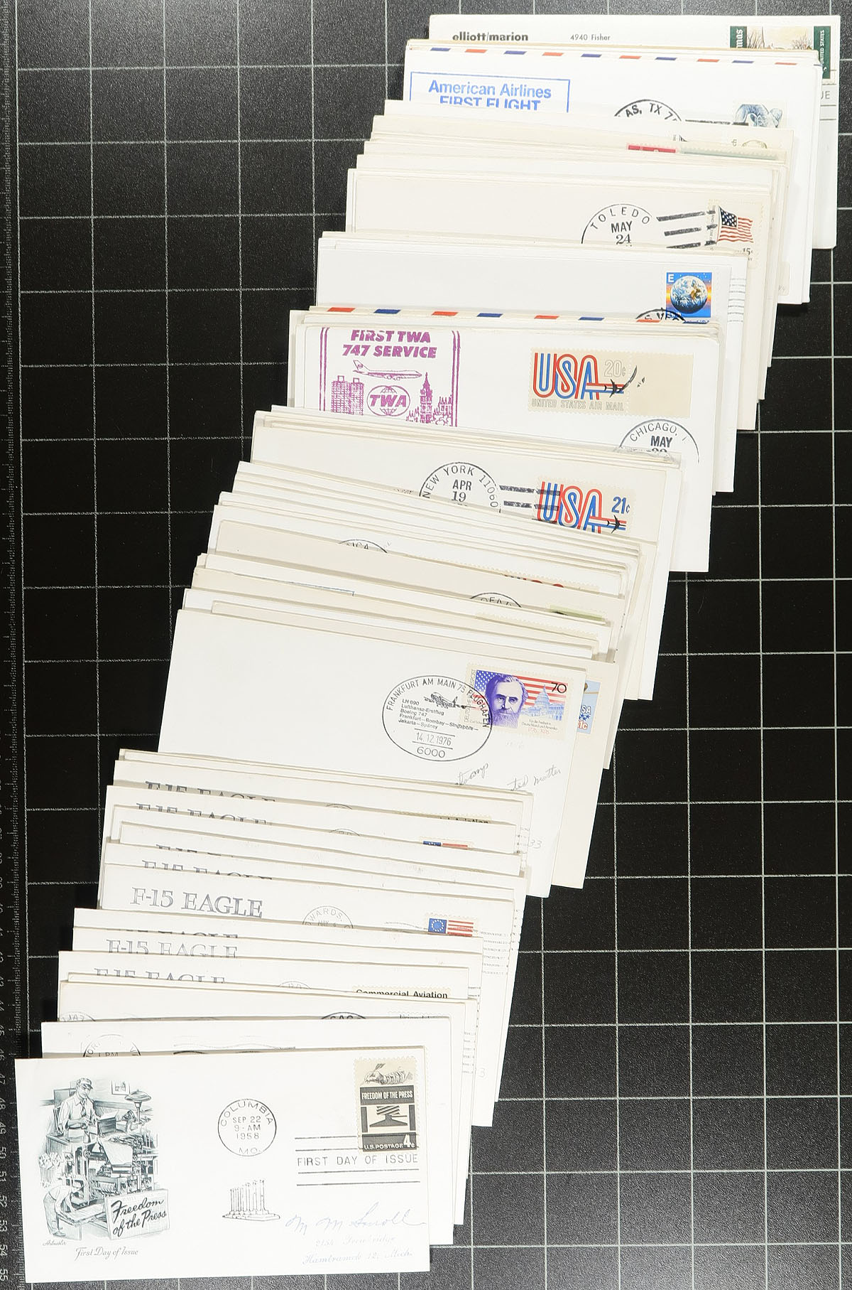 Lovely collection of United States covers in a box, 1950's-1980's, containing roughly 450 items, primarily first day covers, along with space and event covers. We note primarily single frankings with many colourful cachets from makers Cachet Craft, Fleetwood, Art O' Pages, and a few others, along with space covers (noting a few different relevant postmarks). A nice clean group, ideal for collectors or dealers looking for stock, overall very fine. Estimate =