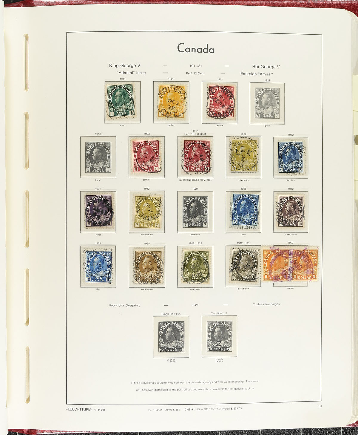 Roughly 850 different used issues from small queens to 1982 housed in a deluxe hingeless red padded Lighthouse album, the stamps selected for mostly socked-on-the-nose CDS cancels. Cancels unchecked for goodies and this fine collection is ready for continuation. The album alone retails for over $400.00! Estimate =
