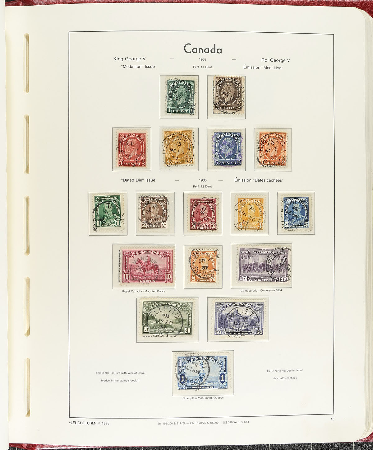 Roughly 850 different used issues from small queens to 1982 housed in a deluxe hingeless red padded Lighthouse album, the stamps selected for mostly socked-on-the-nose CDS cancels. Cancels unchecked for goodies and this fine collection is ready for continuation. The album alone retails for over $400.00! Estimate =