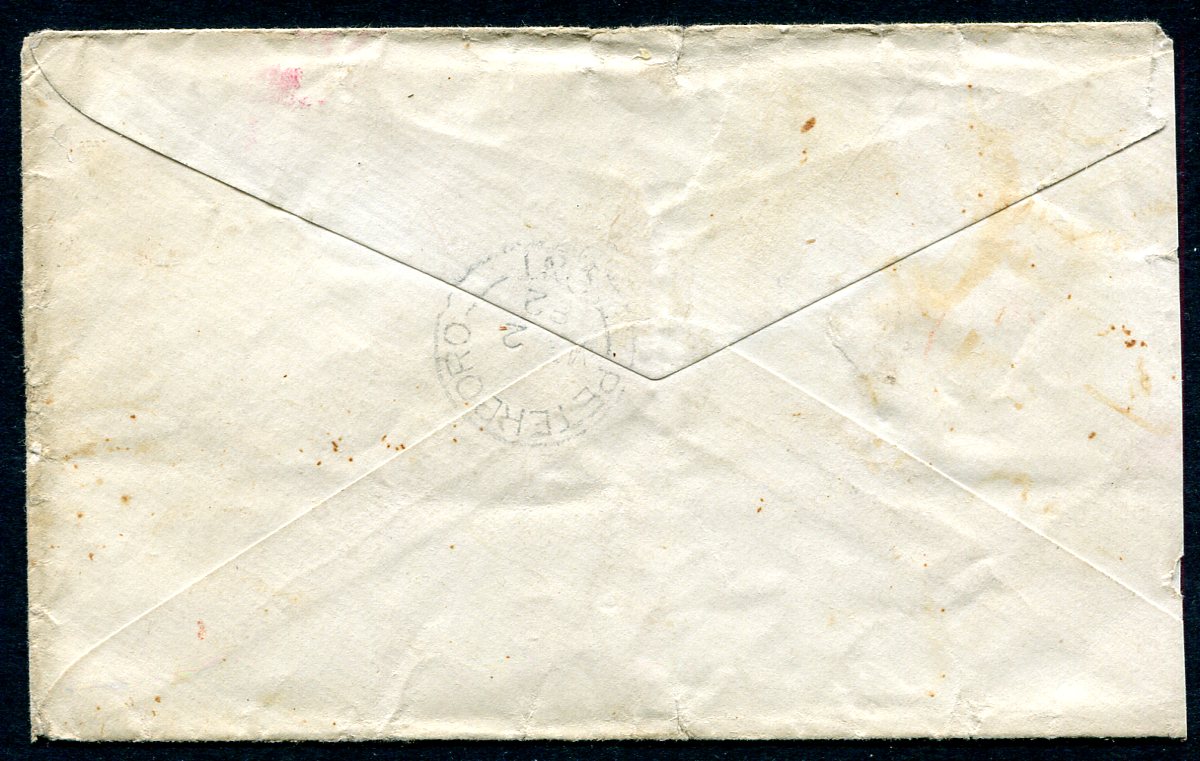 Western Canada Postal History. FORT ASSINABOINE/MONT. FEB 18 1882 CDS on cover with USA 3c. Washington type of #A46 addressed to PETERBORO/ONT. MR 2/82 CDS receiver on reverse. Note this cover is 4 months earlier than the similar cover written up in 'The Northerner" #56 August 2005 which describes that mail from southwestern Assiniboia or southern Alberta to eastern Canada was routed through Montana during 1882. On May 8, 1882, the district of Assiniboia was established for postal purposes so this cover pre-dates the existence of Assiniboia district. Slightly cut down at left, edge tears, some foxing. A great rarity! Estimate =