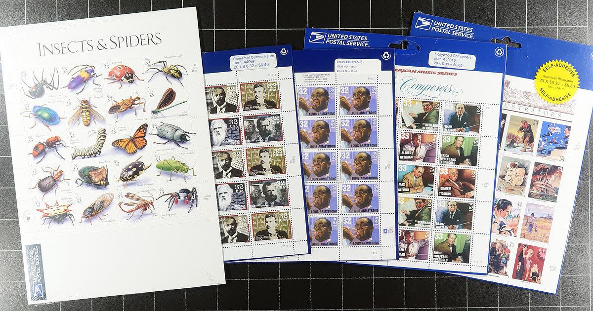 Modern Postage Medley. A wonderful assortment of 1970's to 1990's mint sheets & multiples, including the sought-after 1994 issued "Legends of the West" sheet, with Bill Pickett error stamps (along with matching corrected sheet). Also includes a smattering of used modern sheets. The perfect "postage plus" lot for any collector or dealer. Face value alone is US$316.35 ($442.65 CDN), with the owners catalogue value over US$740.00. Estimate =