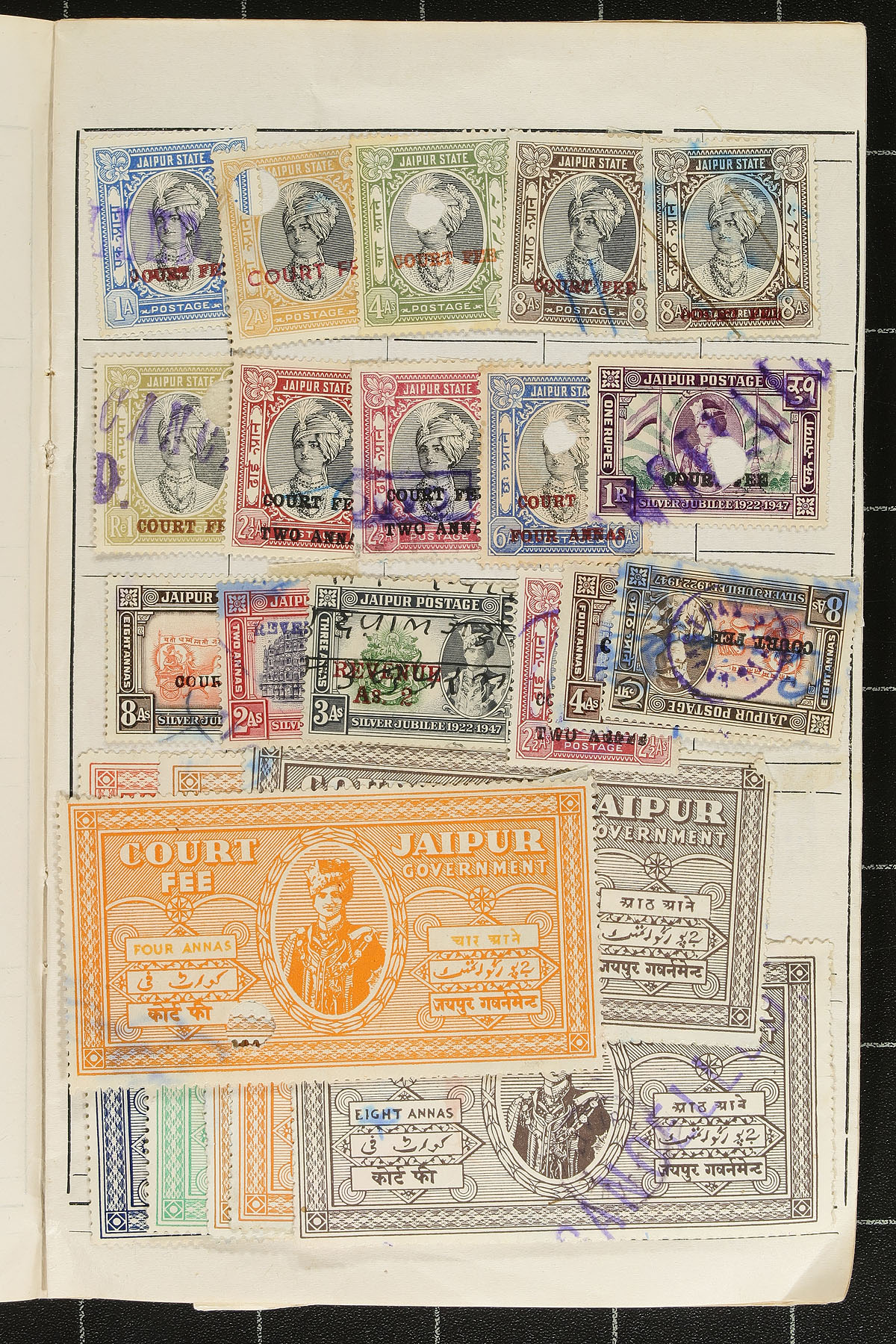 Old-time HOARD of India States Revenue Stamps. Held in small old-springback album and a couple of bulging collector made booklets, with several hundred stamps in total. A fascinating group, from a variety of states and usages. An opportunity like this to pick up and old-time holding does not happen often. Estimate =