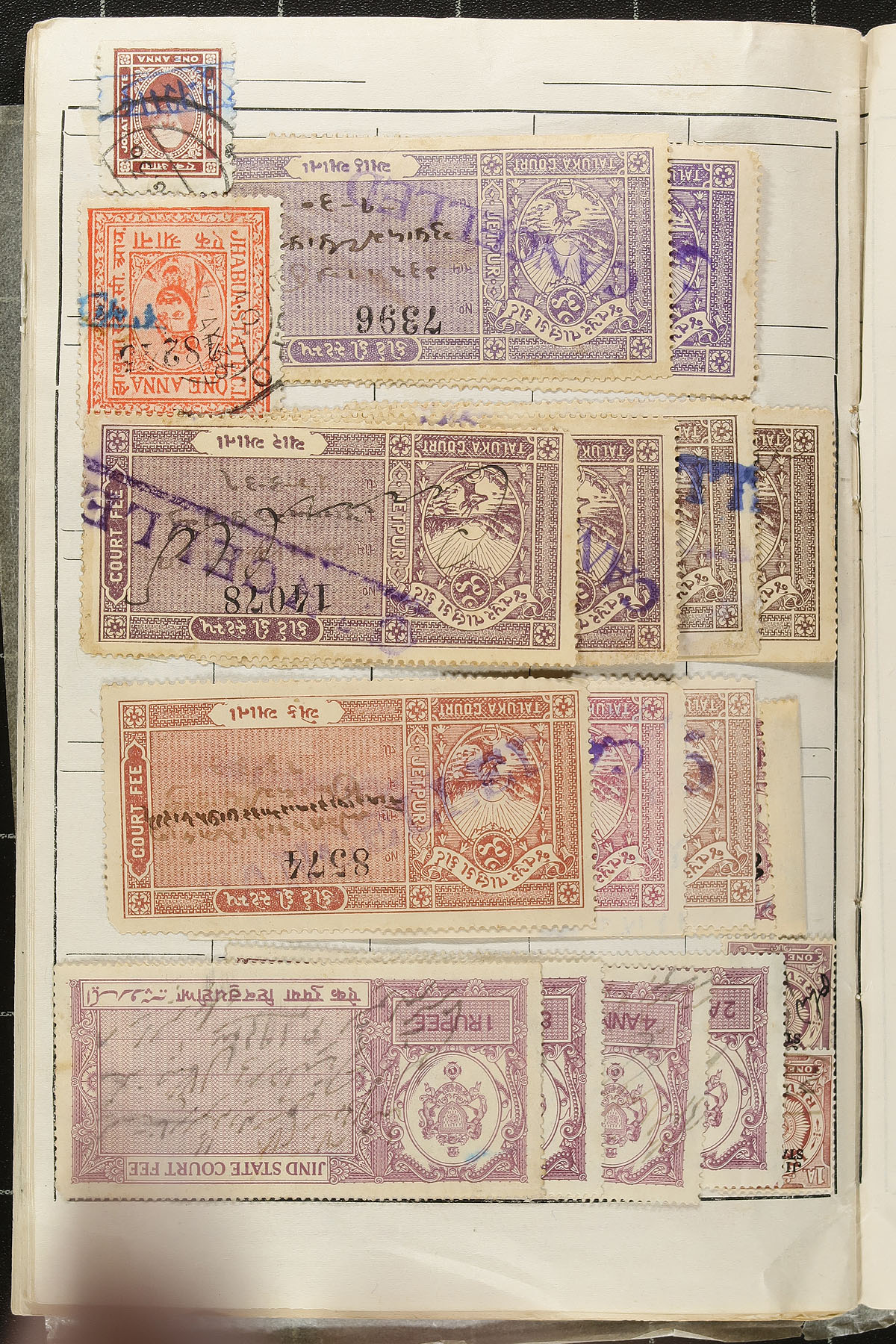Old-time HOARD of India States Revenue Stamps. Held in small old-springback album and a couple of bulging collector made booklets, with several hundred stamps in total. A fascinating group, from a variety of states and usages. An opportunity like this to pick up and old-time holding does not happen often. Estimate =