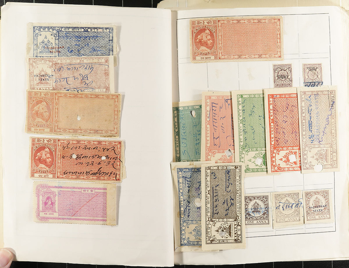 Old-time HOARD of India States Revenue Stamps. Held in small old-springback album and a couple of bulging collector made booklets, with several hundred stamps in total. A fascinating group, from a variety of states and usages. An opportunity like this to pick up and old-time holding does not happen often. Estimate =