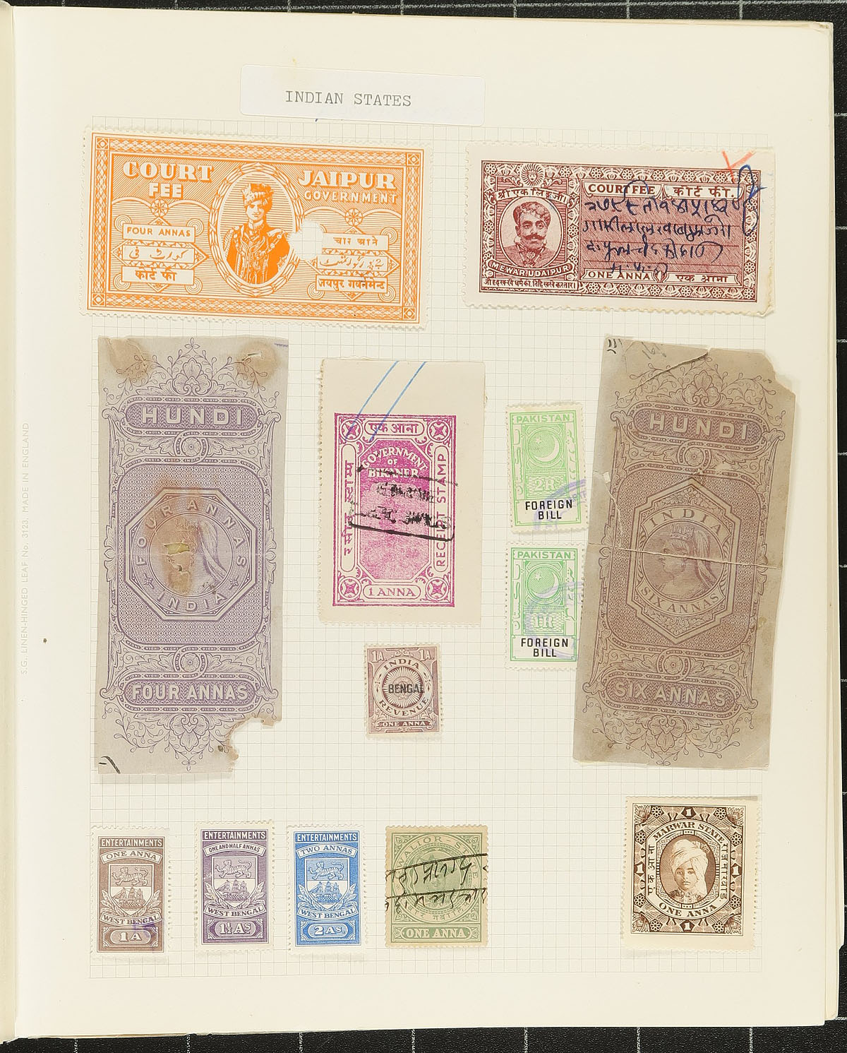 Old-time HOARD of India States Revenue Stamps. Held in small old-springback album and a couple of bulging collector made booklets, with several hundred stamps in total. A fascinating group, from a variety of states and usages. An opportunity like this to pick up and old-time holding does not happen often. Estimate =