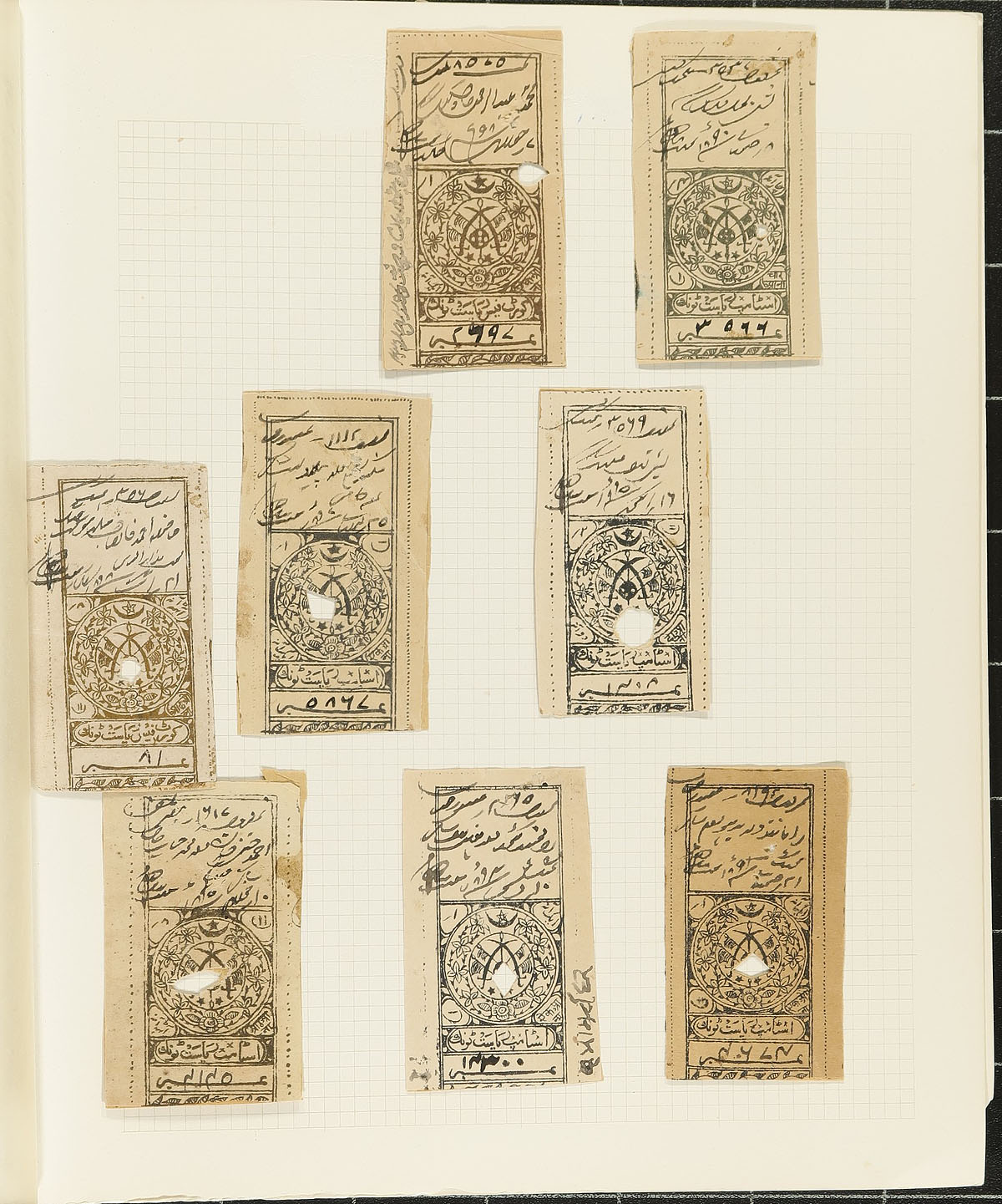 Old-time HOARD of India States Revenue Stamps. Held in small old-springback album and a couple of bulging collector made booklets, with several hundred stamps in total. A fascinating group, from a variety of states and usages. An opportunity like this to pick up and old-time holding does not happen often. Estimate =