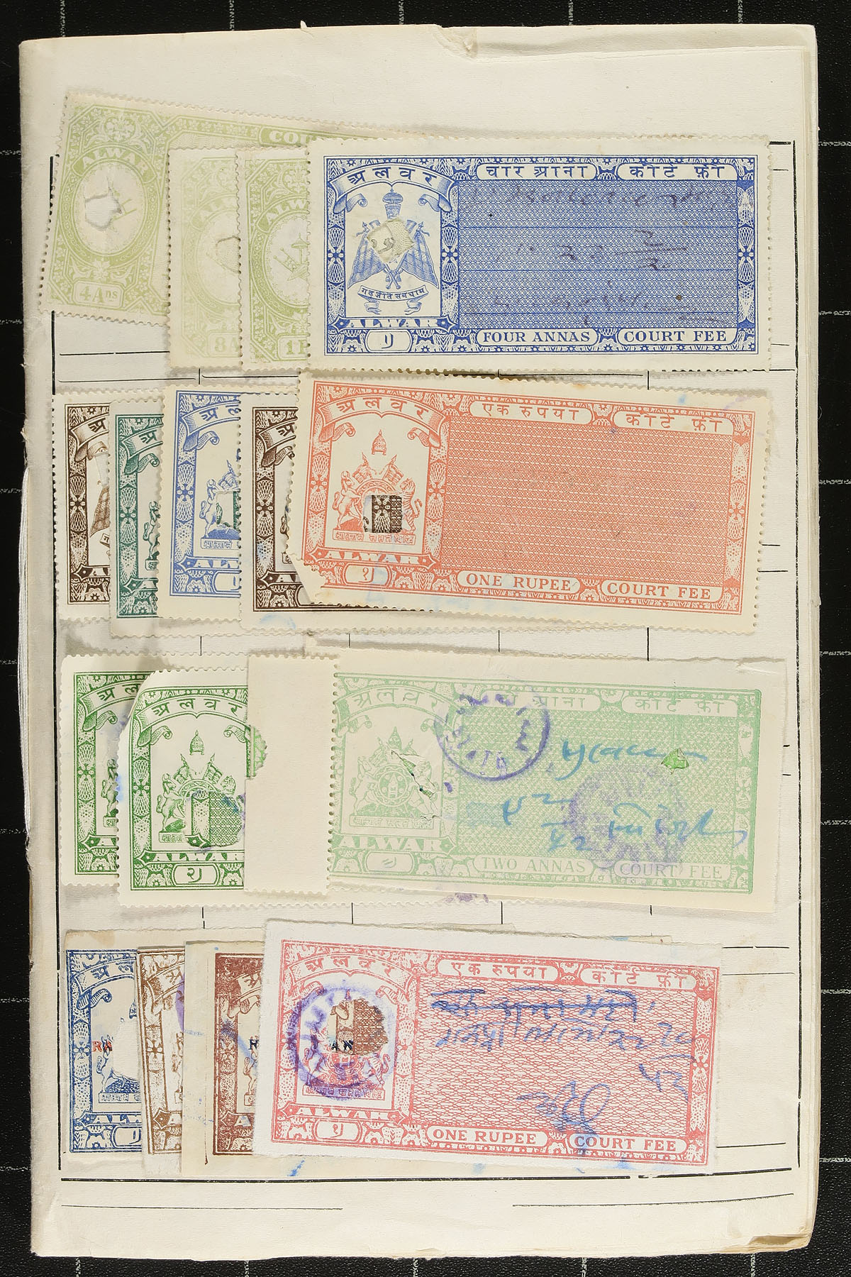 Old-time HOARD of India States Revenue Stamps. Held in small old-springback album and a couple of bulging collector made booklets, with several hundred stamps in total. A fascinating group, from a variety of states and usages. An opportunity like this to pick up and old-time holding does not happen often. Estimate =
