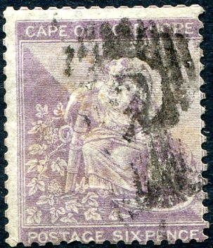 VG/Fine example of the 1877 issued 6p violet "Hope and Symbols of the Colony" issued, with Inverted Watermark variety. Could stand a good soak from some old hinge marks, but a nice example of this seldom seen variety. Listed in Gibbons as #25w (£475.00). 2025 Scott Classic US$440.00 =