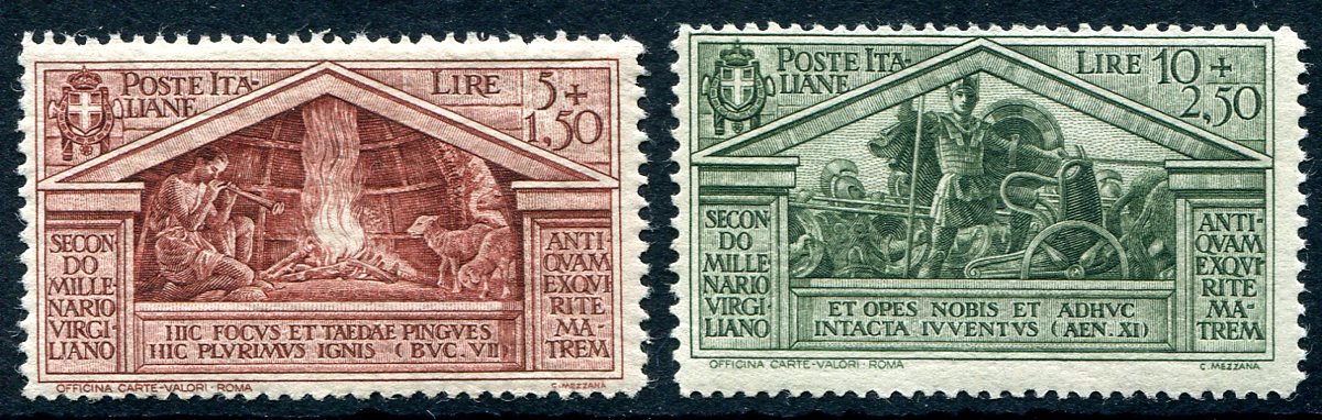 Mint Never Hinged duo of the two highest values of the 1930 "Bimilenary of the Birth of Virgil", with surcharge to fund the National Institute Figli del Littorio. Finding these issues Never Hinged is getting tough to do. 2025 Scott US$300.0 =