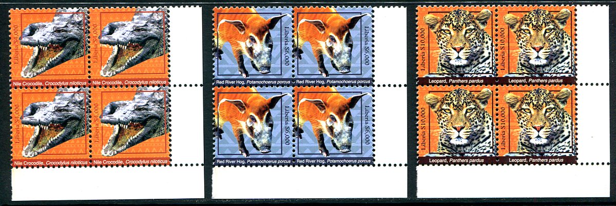 Complete set of three "extreme high value" 2017 Animal definitive issues in Mint Never-Hinged corner blocks of four. The designs feature Nile Crocodile ($4000 value), Red River Hog ($6000 value) and the Leopard ($10,000 value). The Scott catalogue on these is US$430.00 per set (and you have 4 sets here). 2025 Scott US$1,720.00 =