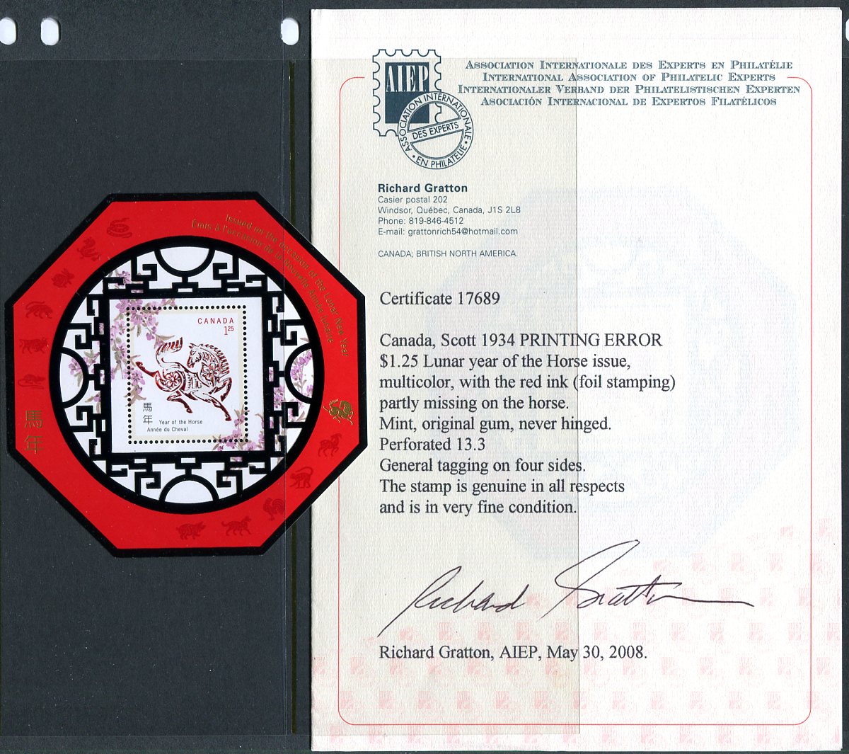 VF mint Never Hinged examples of both the 48c single and $1.25 souvenir sheet of the 2002 "Year of the Horse" Lunar New Years issue, BOTH partially missing the red ink foiling. Unusual, not listed in Unitrade (foil completely missing, #1933a catalogues $1750.00). Both are accompanied by 2008 dated Gratton certificates. Estimate =