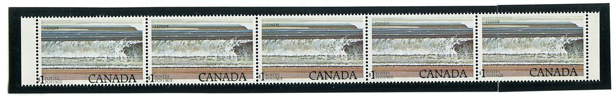 Attractive mint Never Hinged strip of five of the 1979 issued $1.00 Fundy high-value, with shifted black inscription placing "$1 Postes/Postage CANADA" into the margin at left and bottom. Mounted on the original sales card from Saskatoon Stamp Centre. Original (reasonable) retail price =