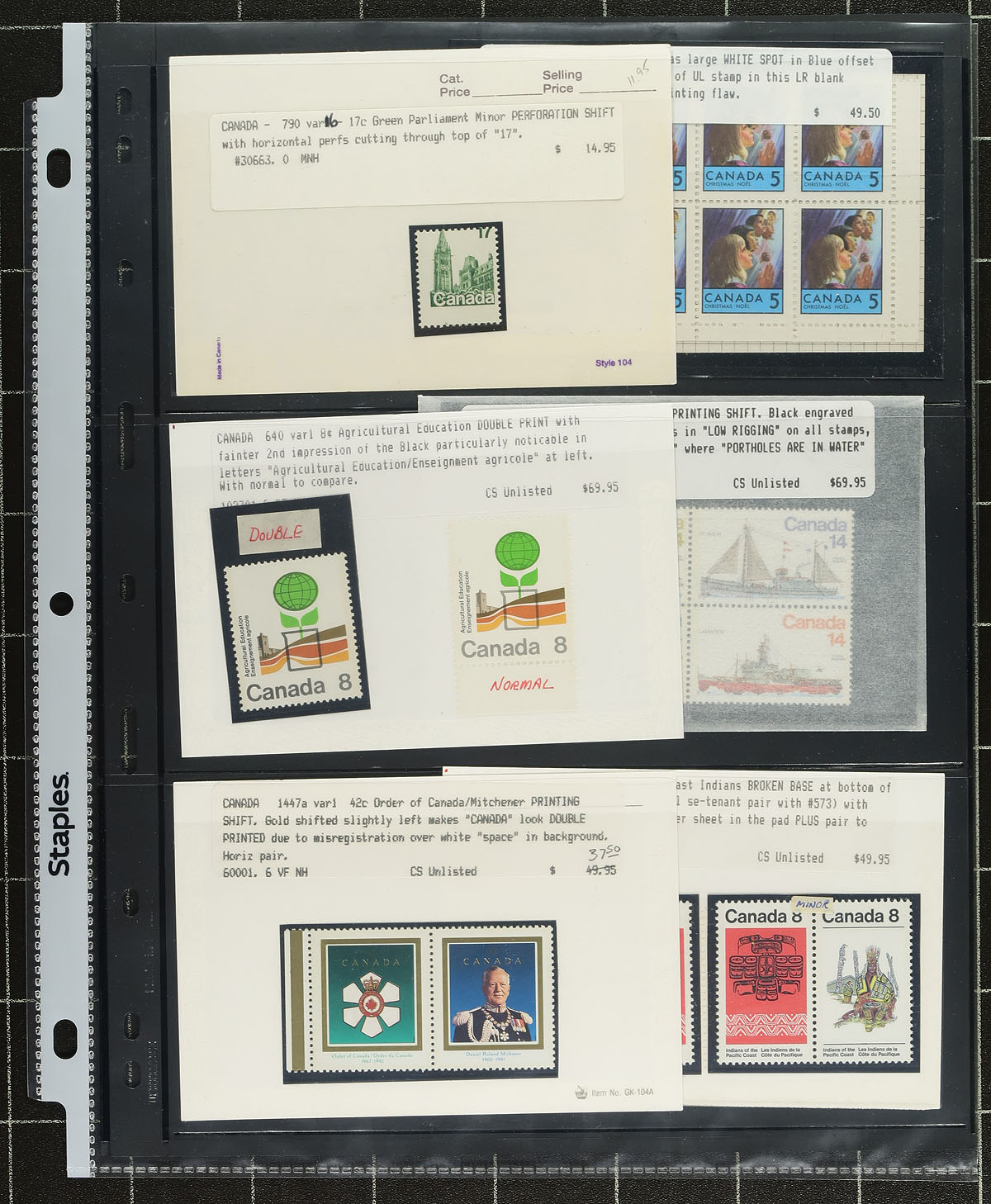 "EFO" Error, Freak and Oddity Holding. A valuable assortment of QEII era varieties, including #1606 (1996 Yukon Gold Rush) with partially missing gold surcharge (with Gratton certificate), 46c "Flag Over Iceberg" gutter strip of 20, 14c Parliament "closed blinds" (unlisted), ink smears, printing shifts, 1-bar tags, misperfs, under-inking, "kiss" prints etc. A wonderful group for the variety hound. Estimate =