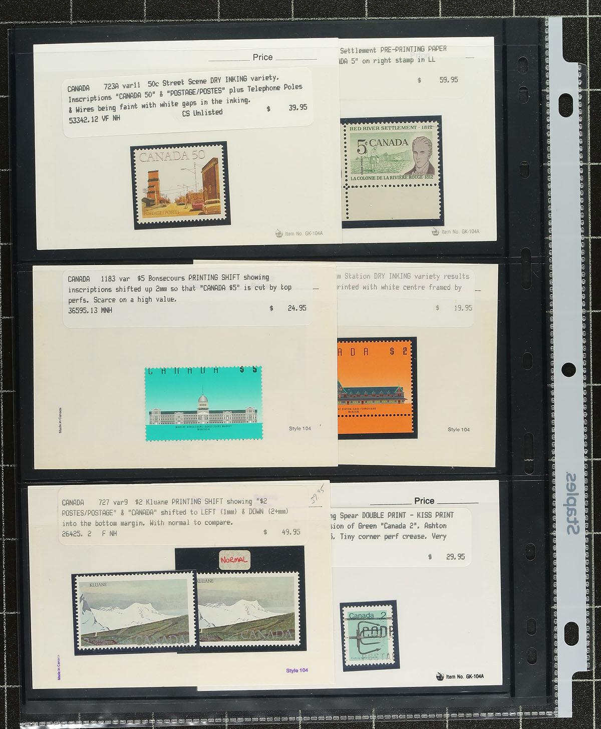 "EFO" Error, Freak and Oddity Holding. A valuable assortment of QEII era varieties, including #1606 (1996 Yukon Gold Rush) with partially missing gold surcharge (with Gratton certificate), 46c "Flag Over Iceberg" gutter strip of 20, 14c Parliament "closed blinds" (unlisted), ink smears, printing shifts, 1-bar tags, misperfs, under-inking, "kiss" prints etc. A wonderful group for the variety hound. Estimate =