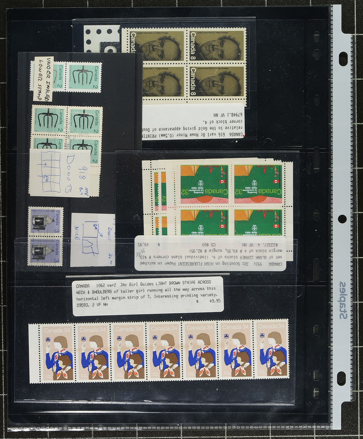 "EFO" Error, Freak and Oddity Holding. A valuable assortment of QEII era varieties, including #1606 (1996 Yukon Gold Rush) with partially missing gold surcharge (with Gratton certificate), 46c "Flag Over Iceberg" gutter strip of 20, 14c Parliament "closed blinds" (unlisted), ink smears, printing shifts, 1-bar tags, misperfs, under-inking, "kiss" prints etc. A wonderful group for the variety hound. Estimate =