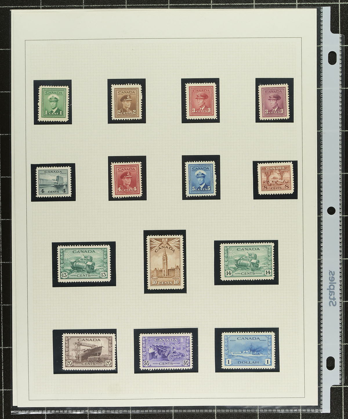 A "dueling" mint and used George VI collection, in mounts on the original collector's pages including the War issue, Peace issue, "Postes/Postage" and CAPEX 1951. The mint is hinged, generally lightly and used is better than usual for the period. Includes coils for the "War" / "Postes/Postage". A very tidy lot. 2025 Scott US$322.00 =