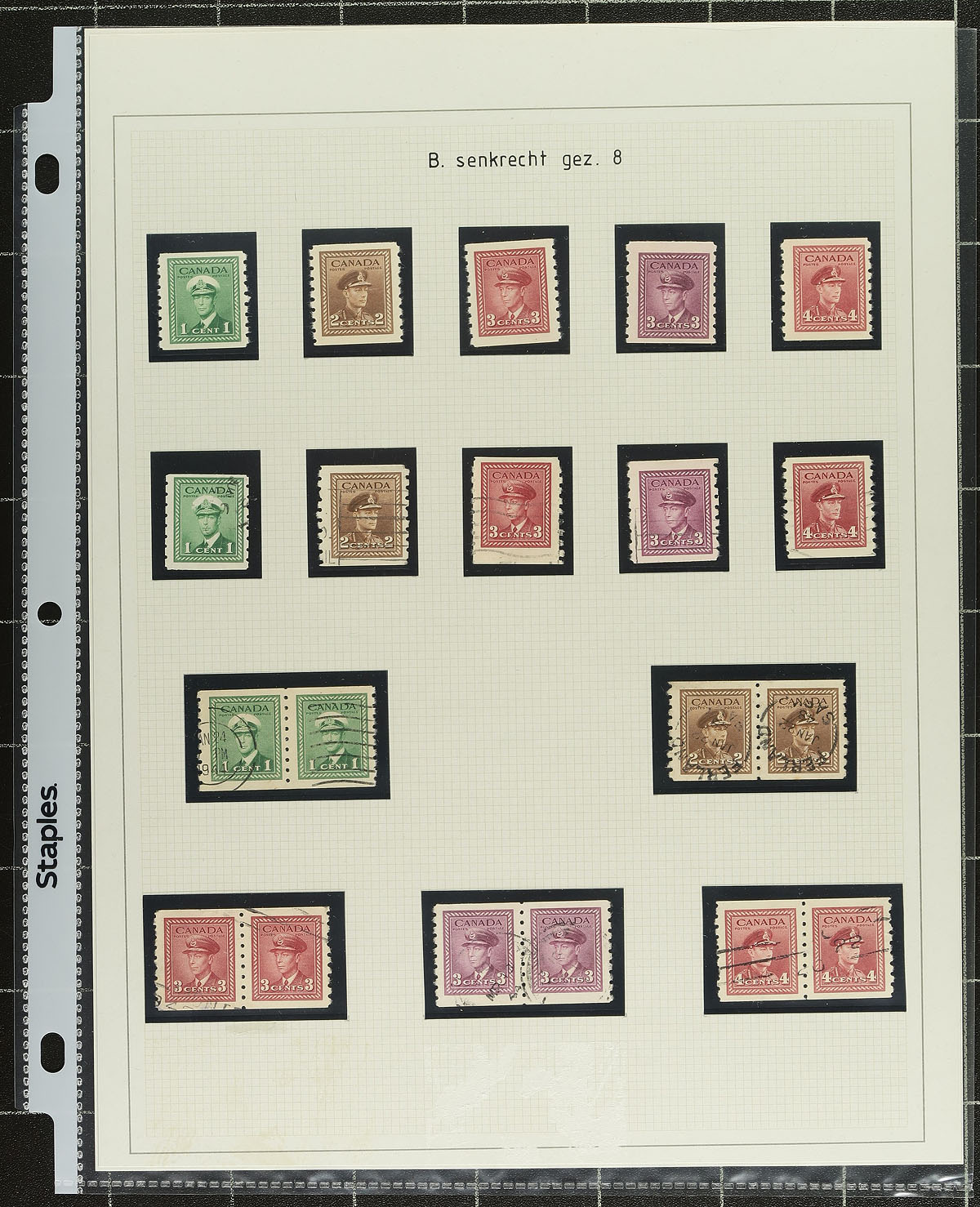 A "dueling" mint and used George VI collection, in mounts on the original collector's pages including the War issue, Peace issue, "Postes/Postage" and CAPEX 1951. The mint is hinged, generally lightly and used is better than usual for the period. Includes coils for the "War" / "Postes/Postage". A very tidy lot. 2025 Scott US$322.00 =