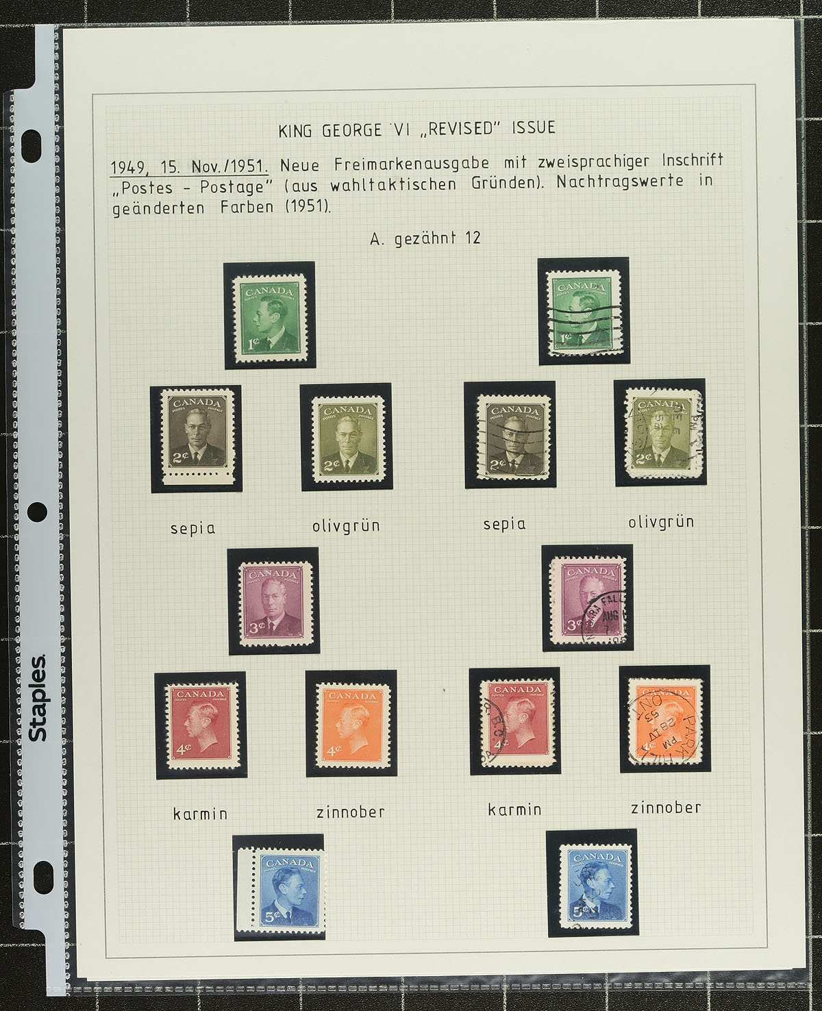 A "dueling" mint and used George VI collection, in mounts on the original collector's pages including the War issue, Peace issue, "Postes/Postage" and CAPEX 1951. The mint is hinged, generally lightly and used is better than usual for the period. Includes coils for the "War" / "Postes/Postage". A very tidy lot. 2025 Scott US$322.00 =