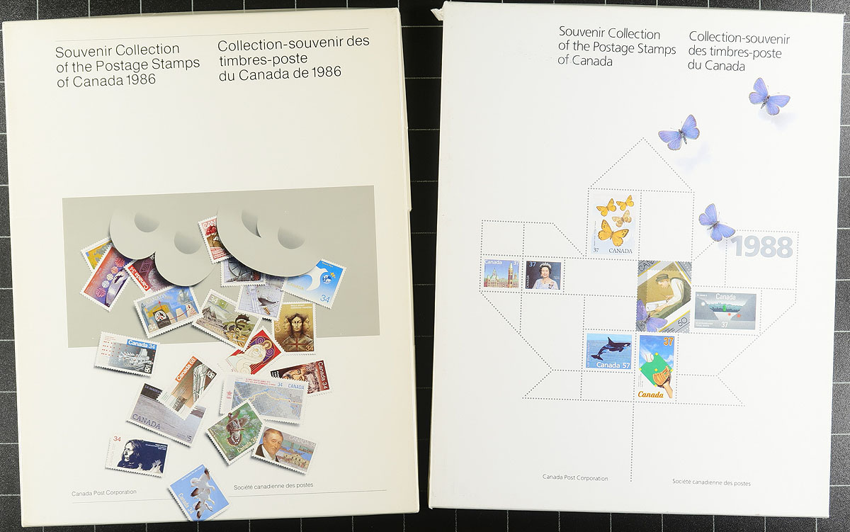 Balance of consignment offering, including (in no particular order). 1) A "Scott" Canada Album, with pages to 1982 and a range of mint/used, including a bit of "back of the book" and Provinces. 2) Three Scott "Junior" albums with Worldwide (2) and Canada (1), each with a smattering of mint/used. 3) A "Turkey Dinner" padded album, with a few dozen 1970's mint Canada issues. 4) Canada 1937 / 1939 Royal Visit, large multiples including plate blocks, hinged on pages. 5) Canada "Ships of Canada" Thematic Collection. 6) Canada Annual Collections for 1978, then 1981-1989 inclusive (face value alone $164.42, Unitrade $430.00). Estimate =
