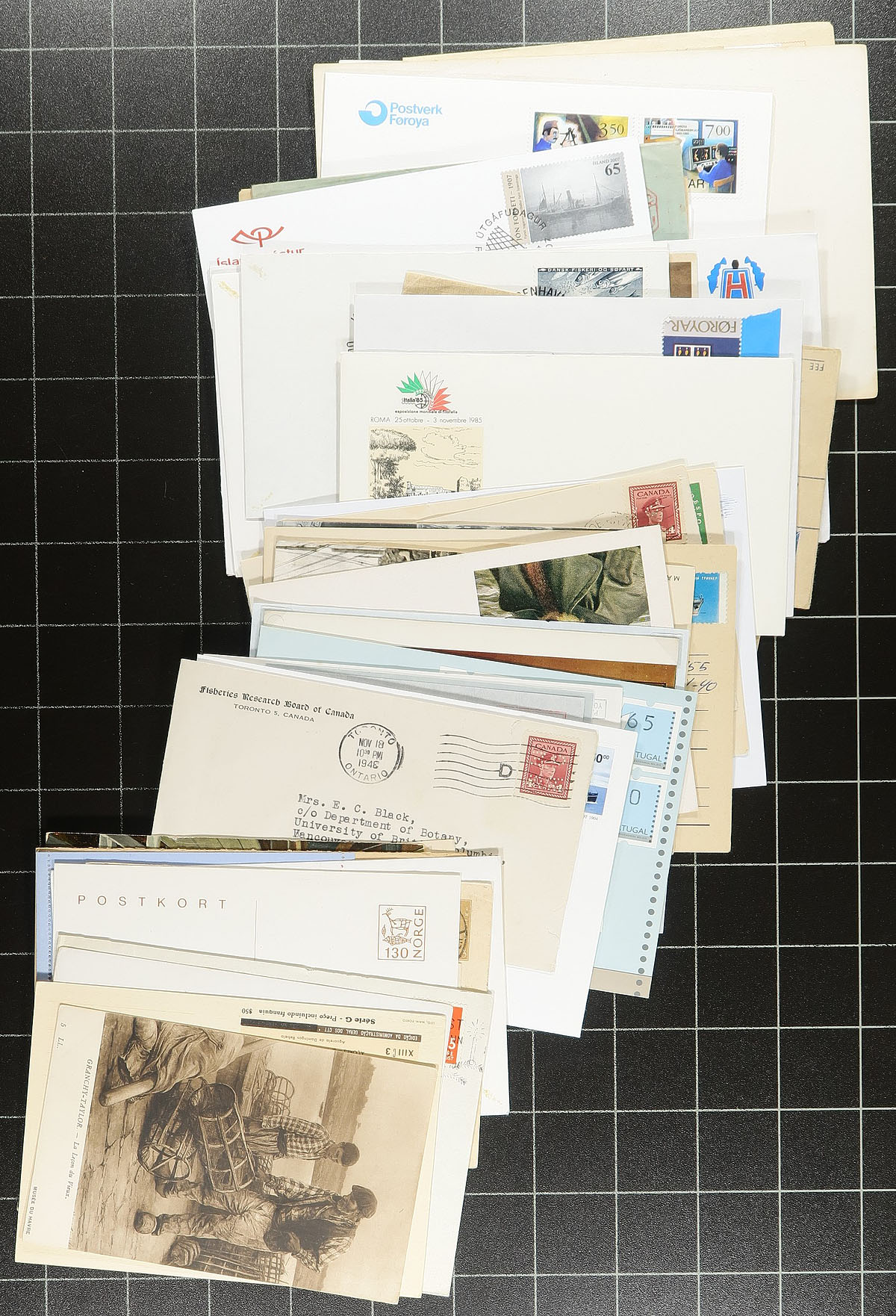 Very interesting "Fishing" related cover and postcard group, containing just over 200 items loose in a box. We note postal stationery, first day covers, postcards, advertising mail, meter mail, all having fishing related cachets, pictorial or slogan postmarks, corner advertising, meters, vessels, processing, and much more. The lot appears to have representation from North America and European countries including Canada, Greenland, Faroe Islands, Denmark, just to name a few, generally ranging from the 1900's to the 1970's. A lovely start to this popular pastime, overall fine to very fine. Estimate =