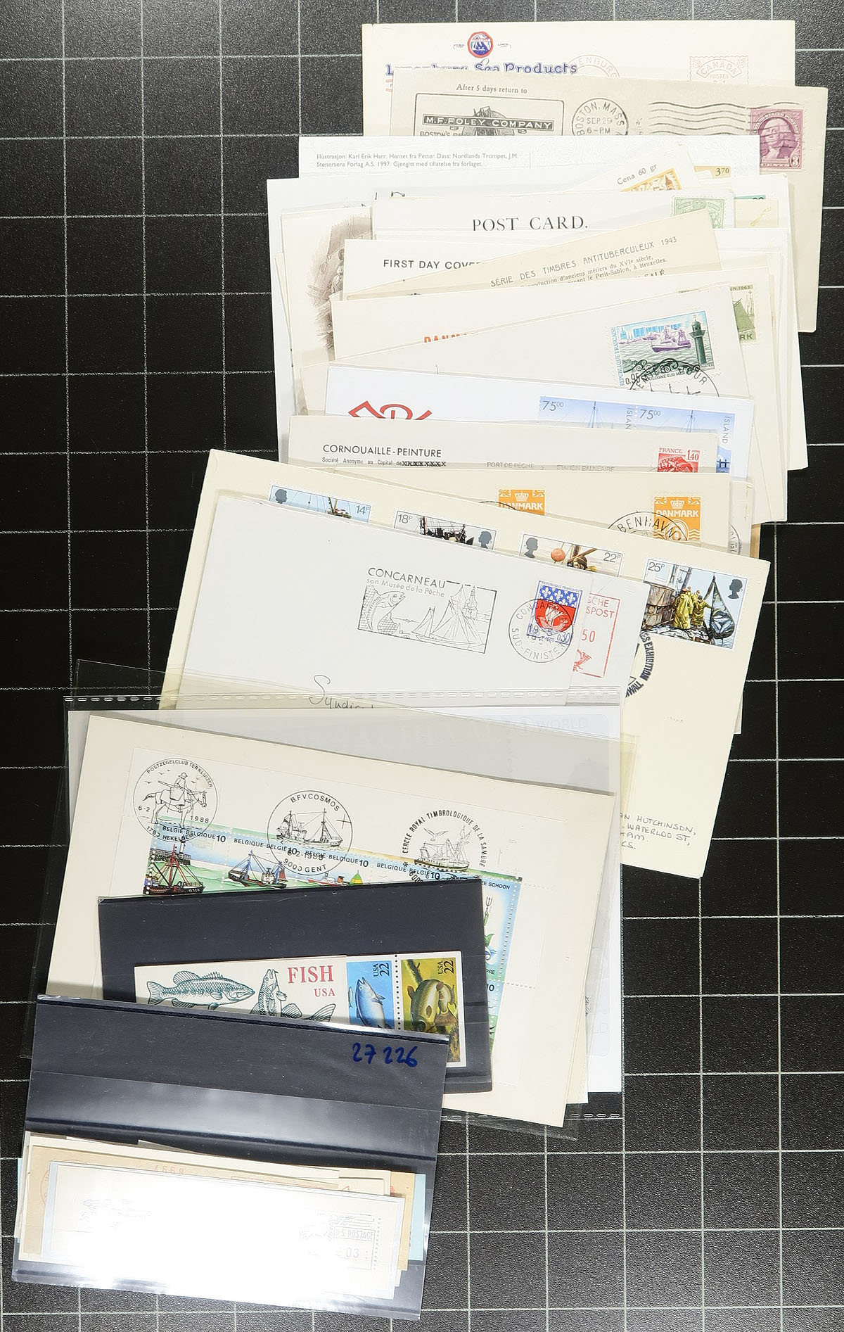 Very interesting "Fishing" related cover and postcard group, containing just over 200 items loose in a box. We note postal stationery, first day covers, postcards, advertising mail, meter mail, all having fishing related cachets, pictorial or slogan postmarks, corner advertising, meters, vessels, processing, and much more. The lot appears to have representation from North America and European countries including Canada, Greenland, Faroe Islands, Denmark, just to name a few, generally ranging from the 1900's to the 1970's. A lovely start to this popular pastime, overall fine to very fine. Estimate =
