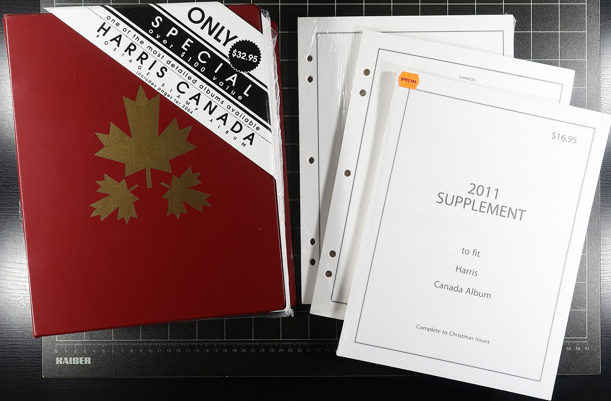 Carton full of useful supplies, including 3x identical brand new Canada Harris albums with pages ranging from 1851-2004 (with spaces for booklets), along with three 2011 supplements. The lot also includes a few stockbooks, a mint sheet file, and a few other useful items. A nice lot with a range of used to brand new condition. Estimate =