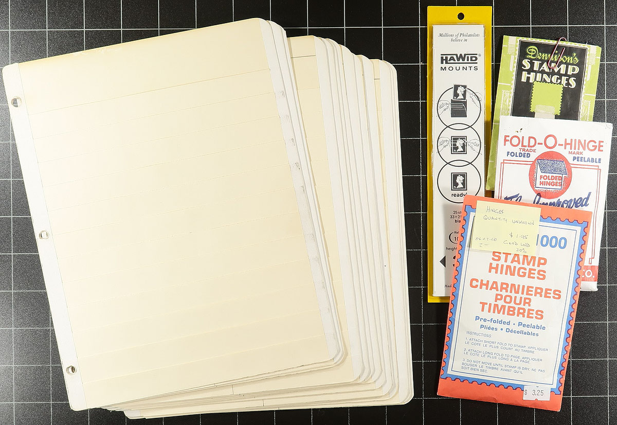 Carton full of useful supplies, including 3x identical brand new Canada Harris albums with pages ranging from 1851-2004 (with spaces for booklets), along with three 2011 supplements. The lot also includes a few stockbooks, a mint sheet file, and a few other useful items. A nice lot with a range of used to brand new condition. Estimate =