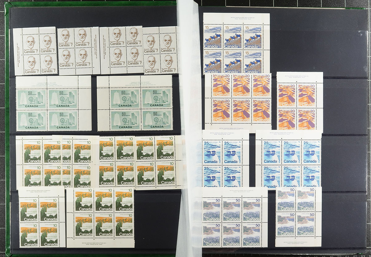 Nice grouping of primarily never hinged material in a full 32 page, 4 line stockbook, containing a nice array of items. The group generally ranges from the 1940's to the 1970's, including many plate blocks (including semi-postals and postage dues), coil pairs, booklets (including a few Conservation booklets), mini panes, precancels, along with used varieties as noted by the owner in 102 cards. A spot check indicated some items cataloguing from $5 to $10 each, making this a very useful lot, with all pages photographed online. Should be worth our estimate. Estimate =