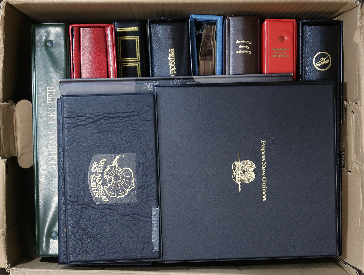 Group of 12 topical "prepared" collections in a carton containing a few hundred covers and stamps, 12 including: "The Medical Letter", "Papua New Guinea" (numismatic first day covers), "Prince Charles Royal Wedding" (2 volumes), "Treasures of King Tut", and more. A nice group for the topical or thematic collector. Estimate =