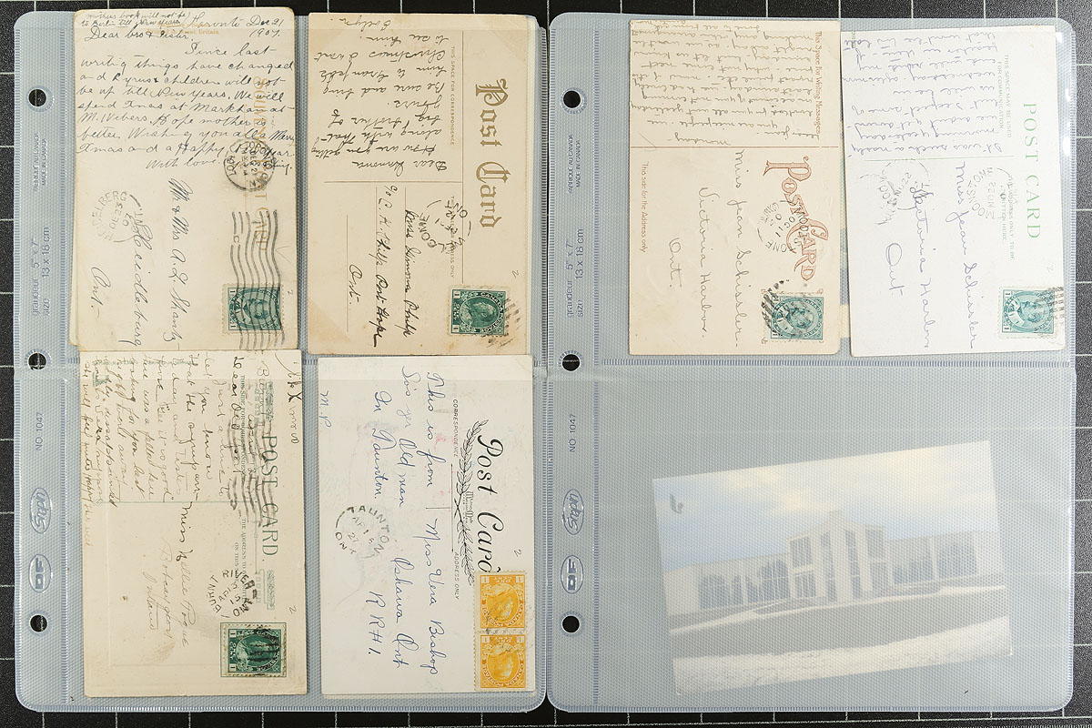 Lovely little group of roughly 90 postcards collected for town postmarks, 1900's-', along with roughly 50 postmarks close cut on piece, all in several plastic pages housed in a binder. The majority of items have Ontario postmarks, along with representation from Quebec, Nova Scotia, and New Brunswick, the majority on postcards franked with the 1c Edward issue. We note split rings, cds, duplex, along with a few modern postmarks, and a few receiving postmarks from foreign mail, noting a good representation of smaller towns. A nice lot for the postmark collector, with a few cards having a few small corner faults etc., overall fine to very fine. Estimate =