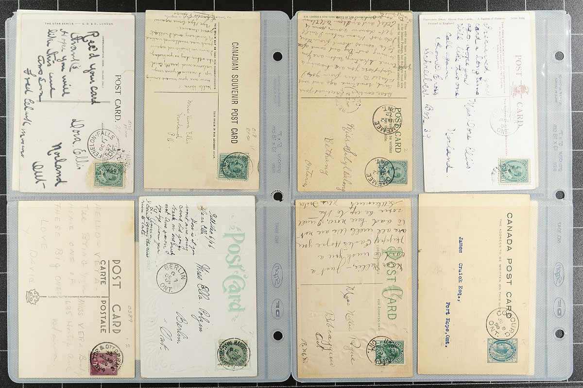 Lovely little group of roughly 90 postcards collected for town postmarks, 1900's-', along with roughly 50 postmarks close cut on piece, all in several plastic pages housed in a binder. The majority of items have Ontario postmarks, along with representation from Quebec, Nova Scotia, and New Brunswick, the majority on postcards franked with the 1c Edward issue. We note split rings, cds, duplex, along with a few modern postmarks, and a few receiving postmarks from foreign mail, noting a good representation of smaller towns. A nice lot for the postmark collector, with a few cards having a few small corner faults etc., overall fine to very fine. Estimate =