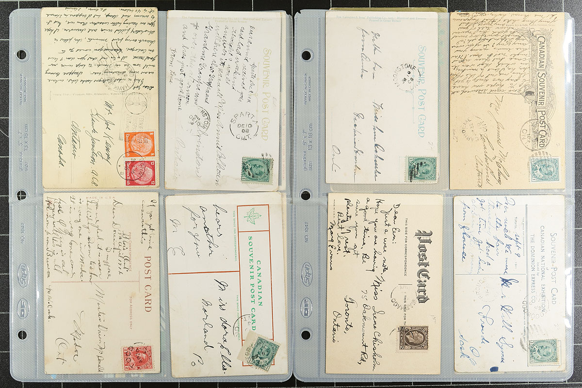 Lovely little group of roughly 90 postcards collected for town postmarks, 1900's-', along with roughly 50 postmarks close cut on piece, all in several plastic pages housed in a binder. The majority of items have Ontario postmarks, along with representation from Quebec, Nova Scotia, and New Brunswick, the majority on postcards franked with the 1c Edward issue. We note split rings, cds, duplex, along with a few modern postmarks, and a few receiving postmarks from foreign mail, noting a good representation of smaller towns. A nice lot for the postmark collector, with a few cards having a few small corner faults etc., overall fine to very fine. Estimate =