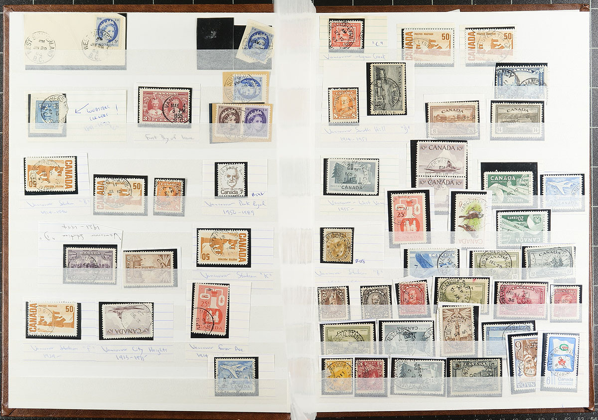 British Columbia Postmarks. A very nice collection of roughly 400 used stamps collected for town postmarks, 1920's-1979. The collection contains stamps on and off piece, noting several Vancouver postmarks, with well identified sub-offices, including Hollyburn, West Summerland, and various others including a few closed offices. We note many "socked on the nose" types, especially difficult to acquire on some of the smaller definitive issues. A lovely collection with all pages photographed online, ideal for the postmark hunter. Estimate =