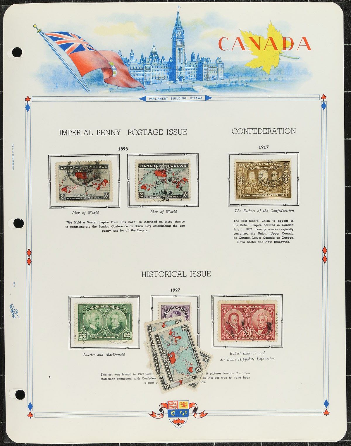 Accumulation of many thousands of used stamps filling a bankers box in a variety of formats, 1870's-1980's. The lot contains 4 red boxes with lids, with a few thousand 102 cards, generally ranging from Scott #25/560 (majority 1940s onwards, did spot 10c Small Queen (x3)), stockbook of used from the Small Queens up to the 1960's (noted a used 50c Bluenose), album pages, and loose material. A nice lot with possible finds for the dedicated collector, including "socked on the nose" town postmarks. A good winter project, overall fine to very fine. Estimate =