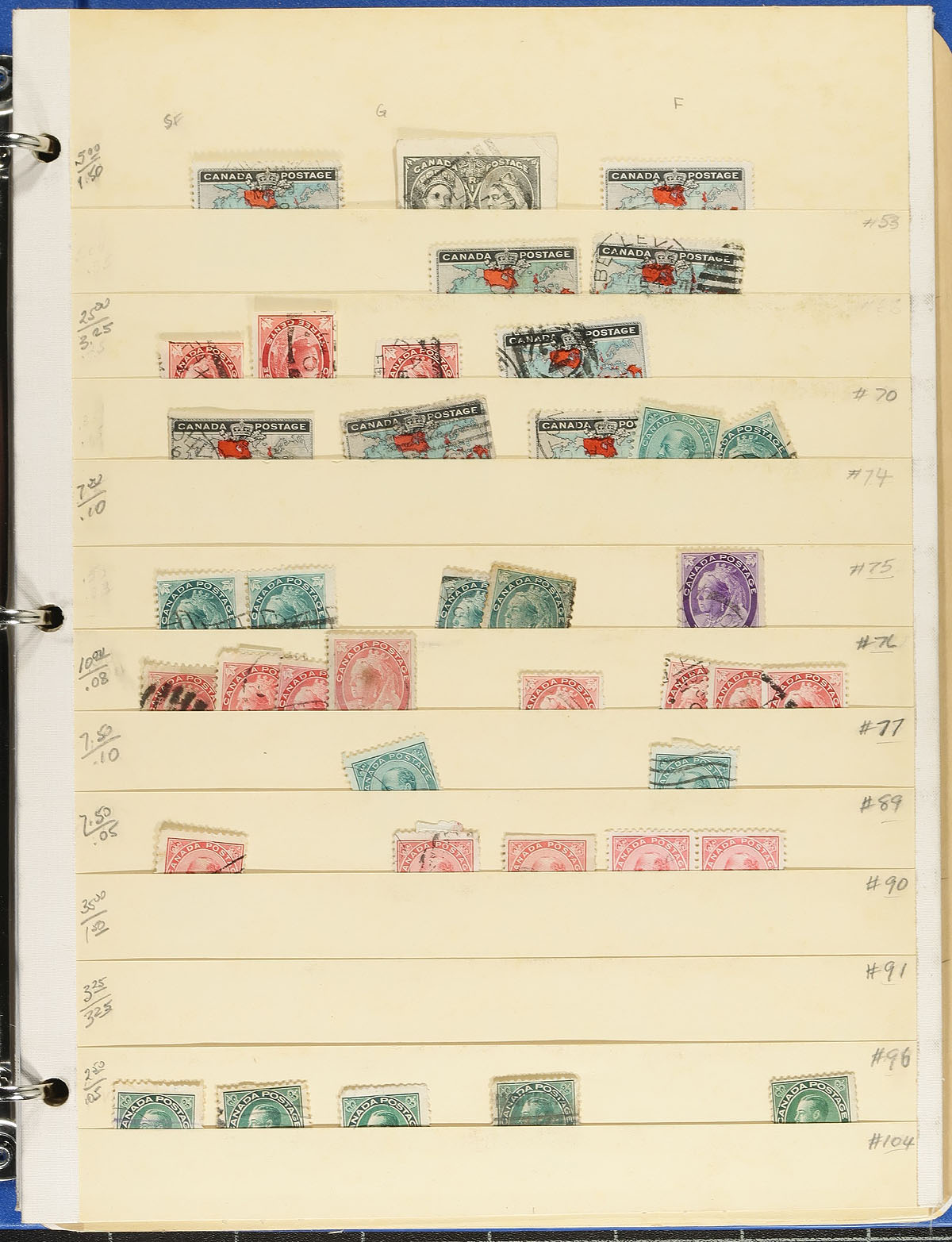 Accumulation of many thousands of used stamps filling a bankers box in a variety of formats, 1870's-1980's. The lot contains 4 red boxes with lids, with a few thousand 102 cards, generally ranging from Scott #25/560 (majority 1940s onwards, did spot 10c Small Queen (x3)), stockbook of used from the Small Queens up to the 1960's (noted a used 50c Bluenose), album pages, and loose material. A nice lot with possible finds for the dedicated collector, including "socked on the nose" town postmarks. A good winter project, overall fine to very fine. Estimate =