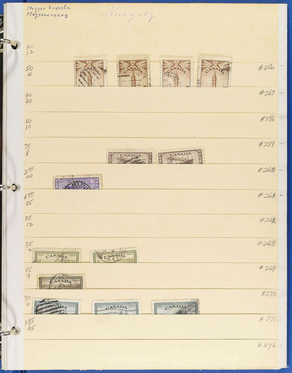 Accumulation of many thousands of used stamps filling a bankers box in a variety of formats, 1870's-1980's. The lot contains 4 red boxes with lids, with a few thousand 102 cards, generally ranging from Scott #25/560 (majority 1940s onwards, did spot 10c Small Queen (x3)), stockbook of used from the Small Queens up to the 1960's (noted a used 50c Bluenose), album pages, and loose material. A nice lot with possible finds for the dedicated collector, including "socked on the nose" town postmarks. A good winter project, overall fine to very fine. Estimate =